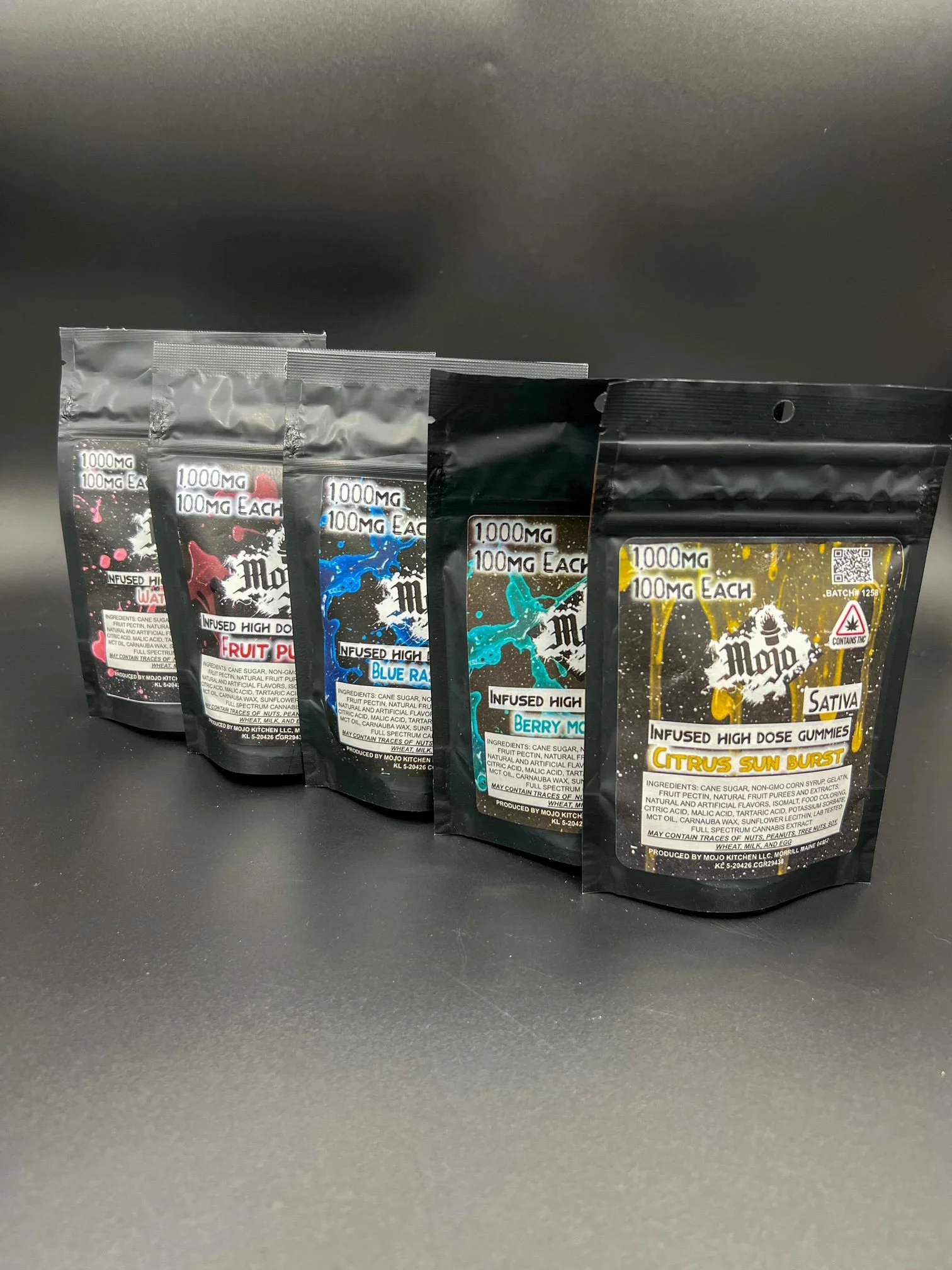 Gummies by MOJO(100mg each/ 1000mg package)These 100mg High Dose gummies are expertly crafted and available in an Indica and a Sativa variety in many mouth watering flavors. They are both full spectrum and gluten free, with 10 per bag